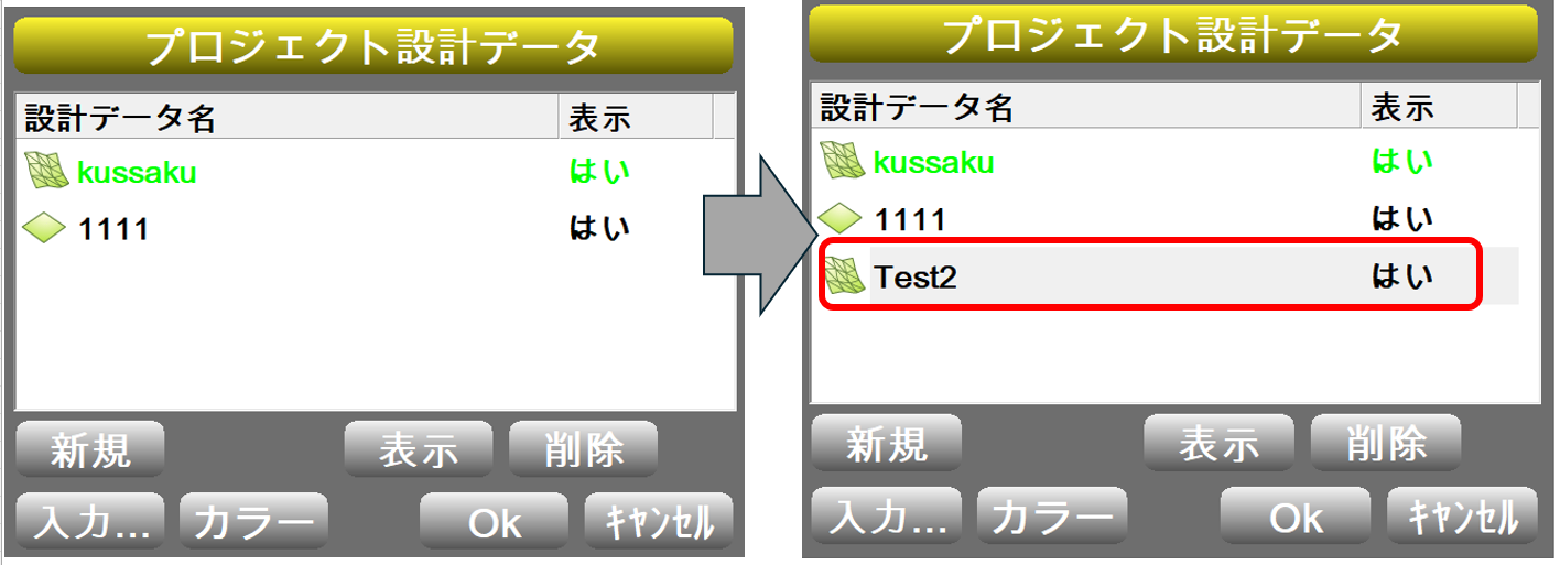 ※別のプロジェクトファイルに変更した場合は、出来形の色塗りは引き継がれません。